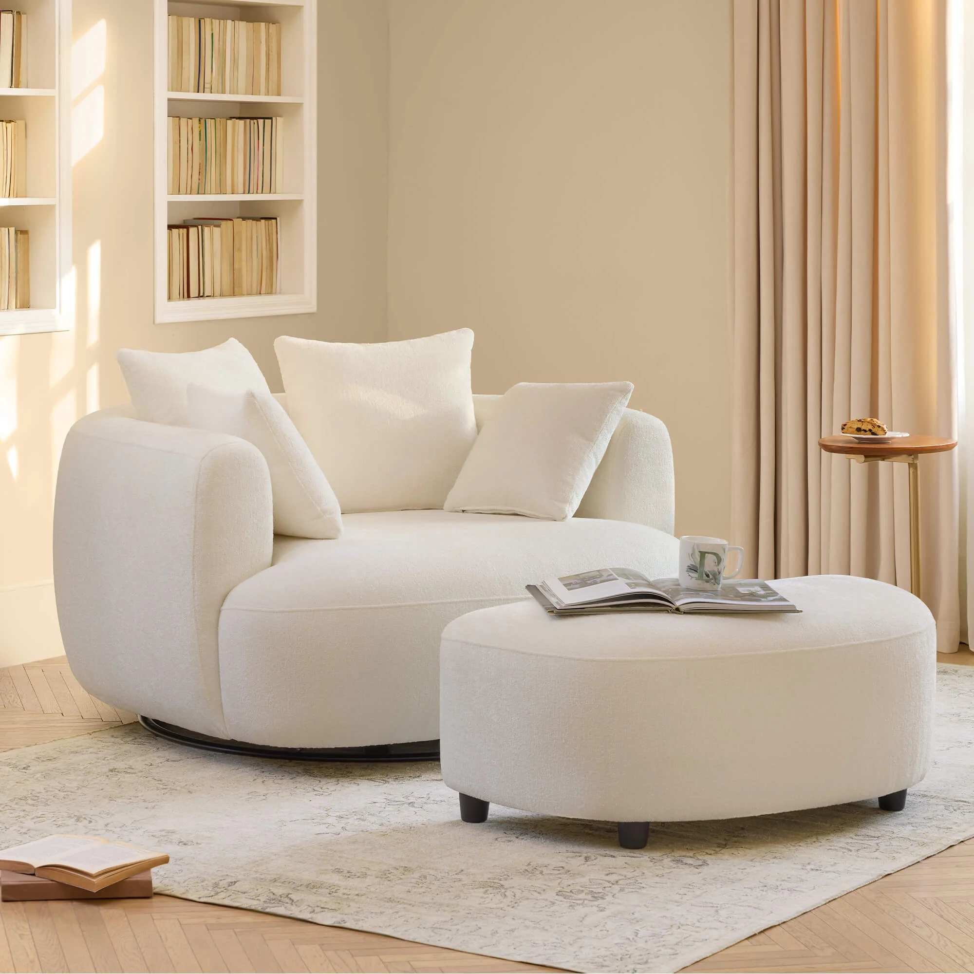 Zenith invites you to slow down with its wide, sculpted seat and cloud-soft curves. The 360° swivel base lets you turn with ease, while the crescent ottoman extends the lounge into a full-body retreat. Wrapped in OEKO-certified, easy-clean performance fabric and supported by kiln-dried, FSC-certified wood, this chair offers medium-firm comfort that holds its shape through everyday life.